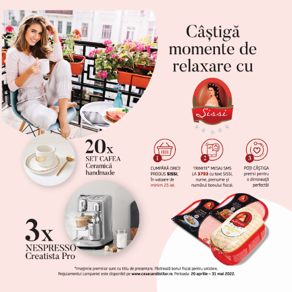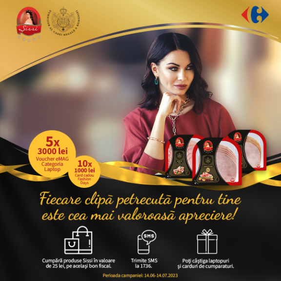 Sissi, cea mai fină șuncă, îți răsplătește fidelitatea printr-un adevărat regal al simțurilor. Înscrie codurile răzuibile de pe produsele Sissi și numărul bonului fiscal de achiziție pe site-ul www.casacaroliștilor.ro după ce ți-ai creat cont sau trimite-le prin SMS la 1736 și colectează cât mai mulți Carolei pentru a te bucura de premiile oferite.