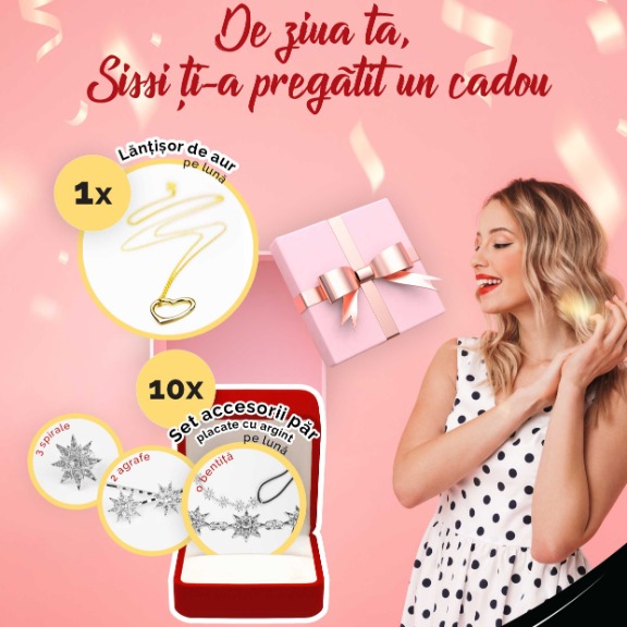 Din apreciere pentru tine, Sissi iti ofera un cadou de ziua ta! Lasa-ne ziua si luna nasterii tale, inscrie-te in campanie si poti castiga un lantisor de aur cu pandantiv in forma de inimioara sau un kit de accesorii de par Sissi, placate cu argint! Lunar, se vor organiza trageri la sorti in care vor participa sarbatoritii lunii respective si se vor acorda: 1 lantisor de aur si 10 kituri de printesa. Perioada campaniei 01.12.2021 – 30.11.2023