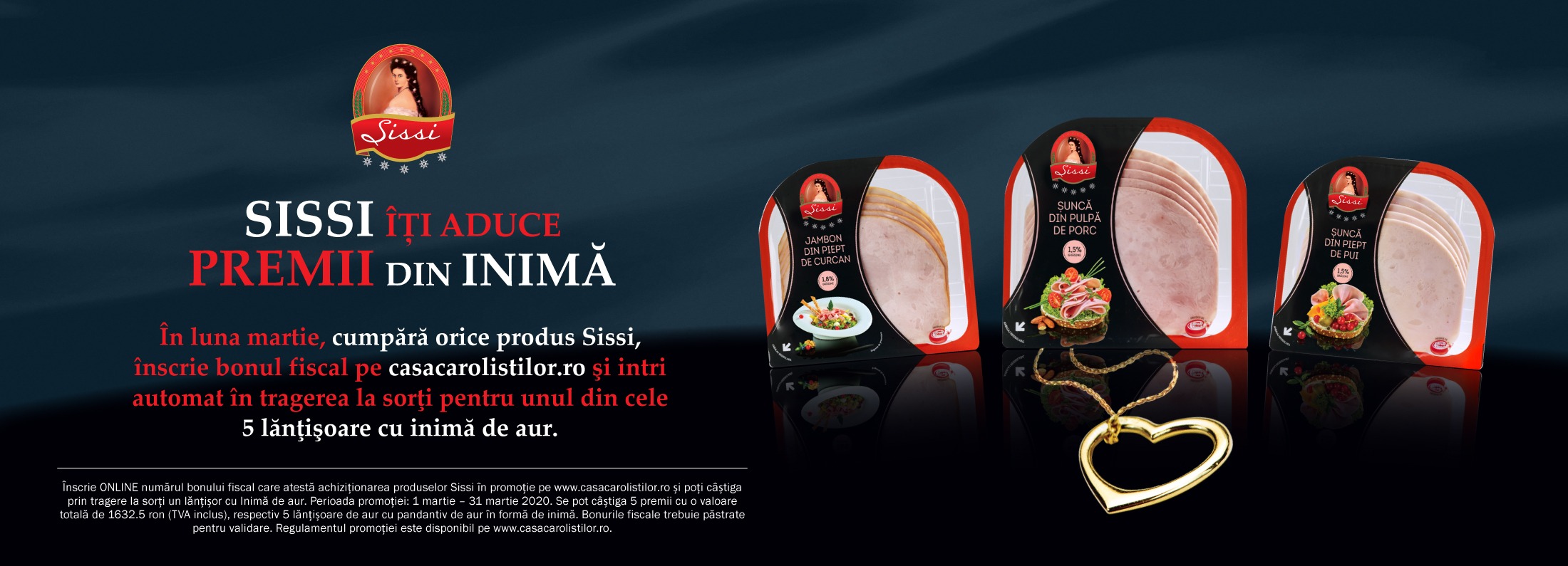 În luna martie cumpără orice produs Sissi de pe https://www.mega-image.ro/, înscrie bonul fiscal pe www.casacarolistilor.ro şi intri automat în tragerea la sorţi pentru unul din cele 5 lănţişoare cu inimă din aur.